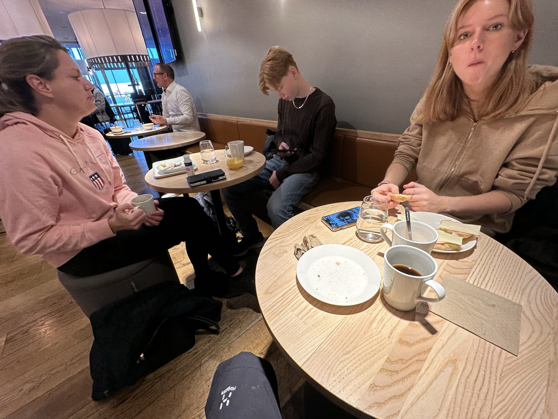 Surdegsfrallor, gröt, kaffe, cola zero. Det var väldigt mycket folk i lokalen – så det här med ekonomisk kris känns som en tidningsanka.