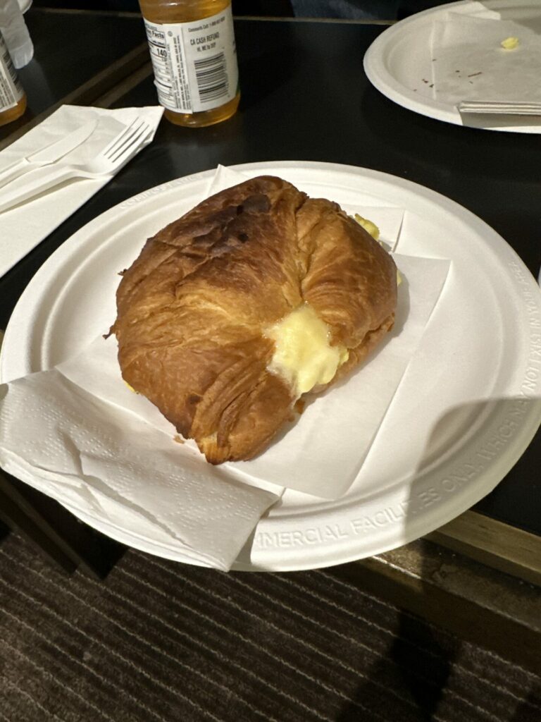 Croissant fylld med ost, korv, äggröra – rykande varm och redo att slukas.