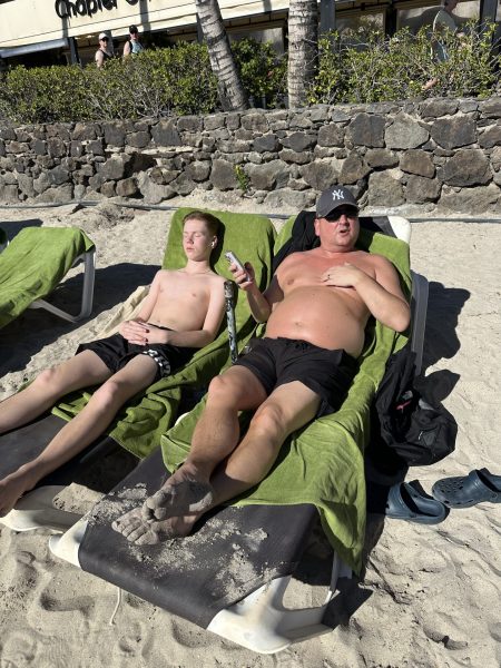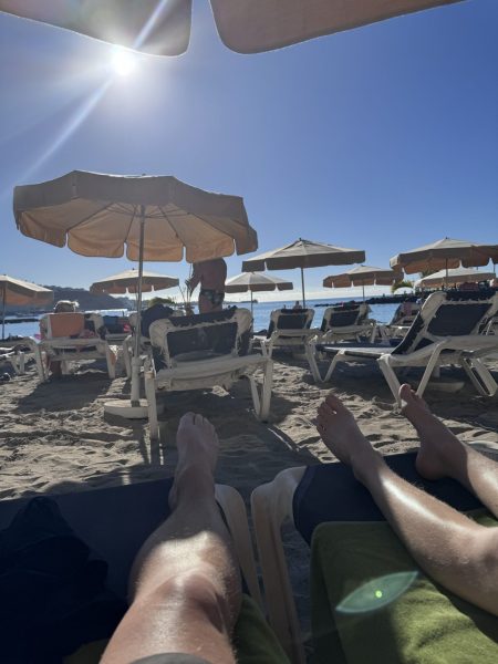 Packade som sillar i välanvända solstolar med hyrparasol.