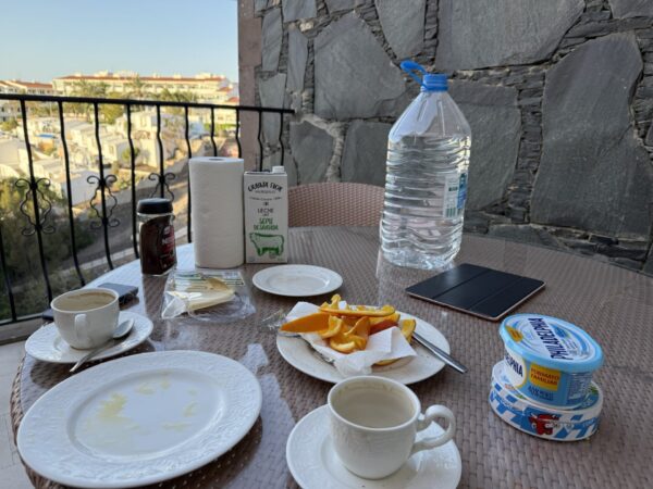 Fredag börjar med frukost ute. Dock med långtröja och mysbyxa.