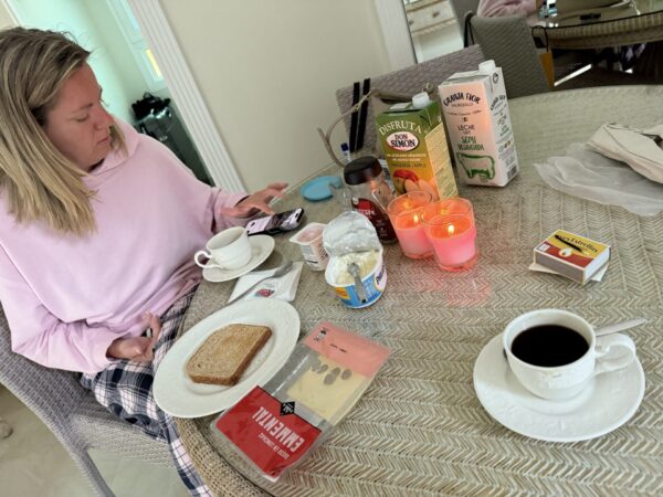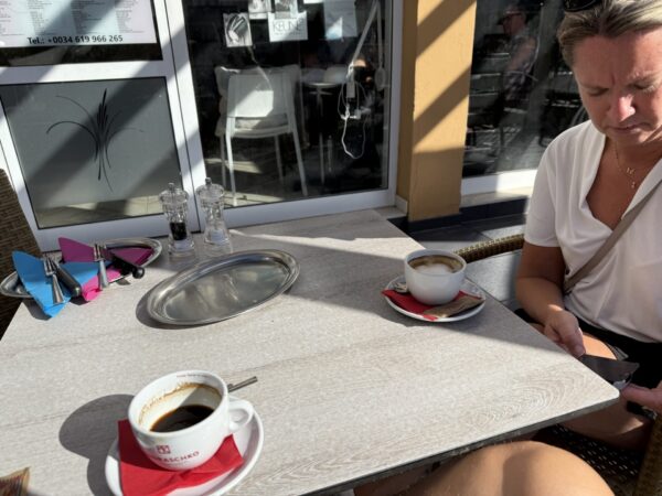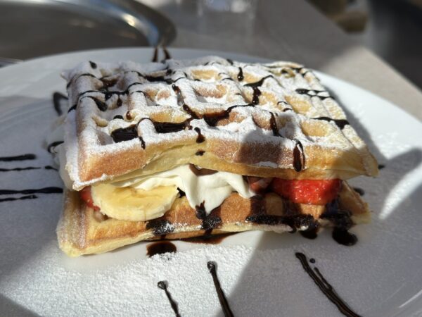 Prommis!Kaffe och våffla med jordgubbar/banan hjälper till när man behöver fylla på med energi.Klockan är ca 17:00 solen börjat bli svagare och luften svalare. Vi har legat i solen hela dagen så After Sun kyler skönt.
