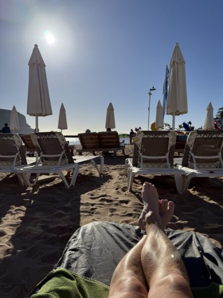 Sista dagen innan hemresa. Vi längtar hem till barnen och vovven. Det blir ett maraton i solstolen, lyssna på bok, spela lite musik och sedan